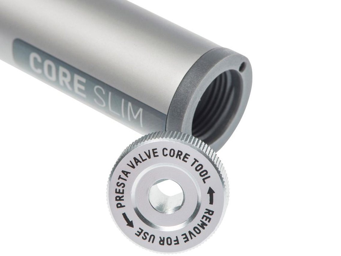 Their presta-only thread-on head sits on a short pull out hose to give more options on which position you pump from. Nervous about unthreading that valve when removing the pump? Enter one of the Core Slim’s awesome features: the Presta Valve Tool. Simply unthread the tool from the back of the pump and tighten your valve prior to threading the hose on. With a narrower and slightly longer body than the Core pump, the Core Slim is a great choice for inflating higher pressure 700c tyres.