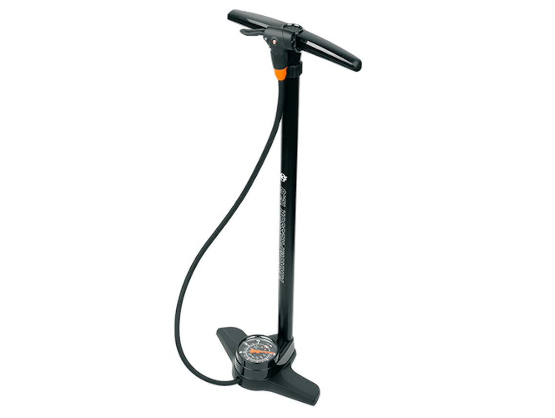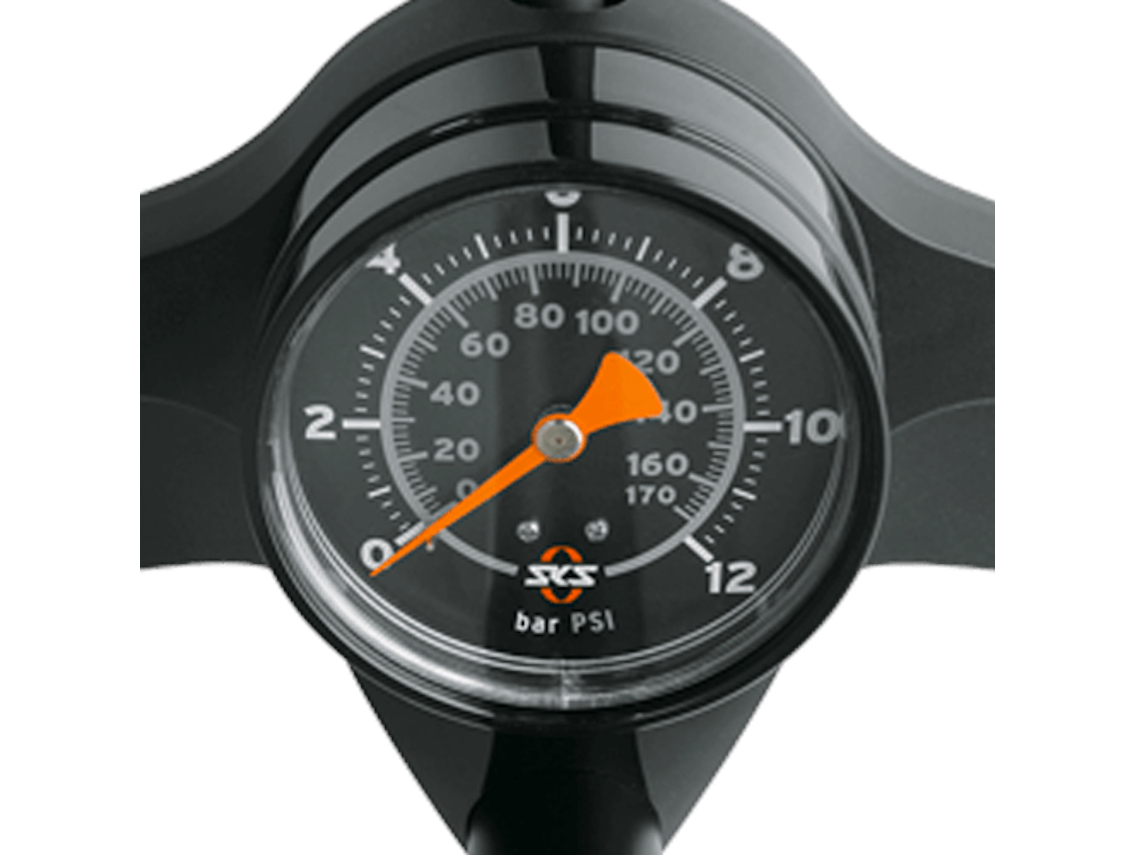 Exerts tremendous pressure: the SKS Airkompressor 12.0 impresses with its extra long steel tube for high volume per stroke, the extra large pressure gauge and the multi valve head for all types of valves.