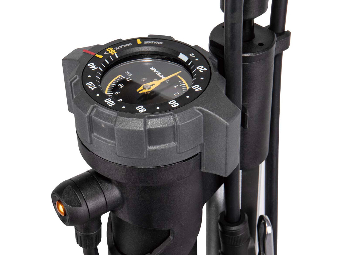 Easy to read top mount gauge. In Charge mode, the pump quickly and easily seeds and fills tubeless tires using the integrated air chamber. Switching to Inflate mode allows you to efficiently and precisely inflate your tire like a traditional pump