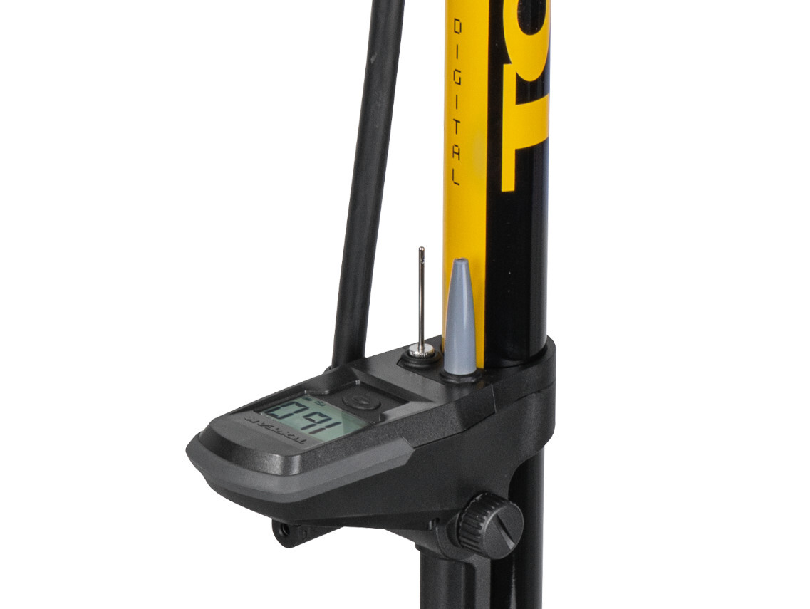 An easy-to-read mid-mounted digital gauge delivers accurate tire pressure readings up to 160psi / 11bar. Hammer type TwinHead DX5 pump head with an extra-long, tangle-free hose makes it easy to reach valve stems.